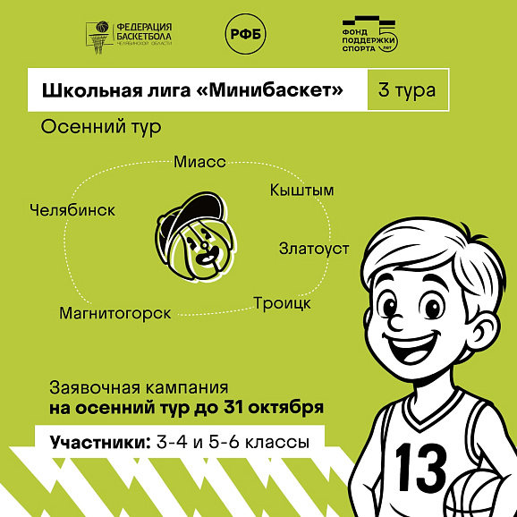 В сезоне 2025/2026 «Минибаскет» пройдет в шести городах – Челябинске, Магнитогорске, Златоусте, Миассе, Кыштыме и Троицке. Чемпионат будет разделен на 3 этапа – осенний, зимний и весенний. По итогам всех туров команды, набравшие наибольшее количество рейтинговых очков (6 лучших коллективов из каждой категории участников), выйдут в региональный финал.