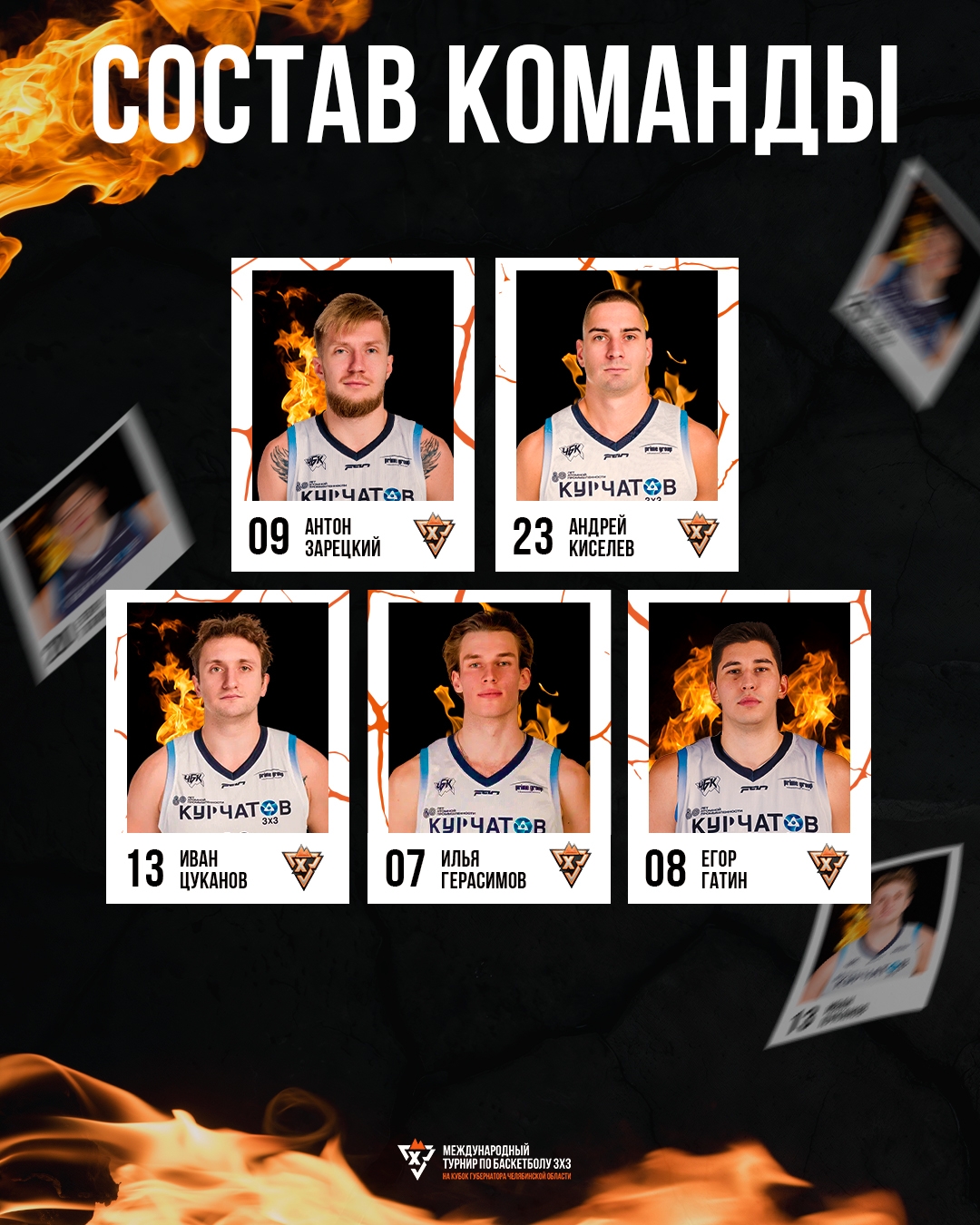 На III Международном турнире по баскетболу 3х3 на Кубок Губернатора Челябинской области за «Курчатов» сыграют Антон Зарецкий, Андрей Киселев, Иван Цуканов, Илья Герасимов и Егор Гатин. Тренер – Станислав Сотников.